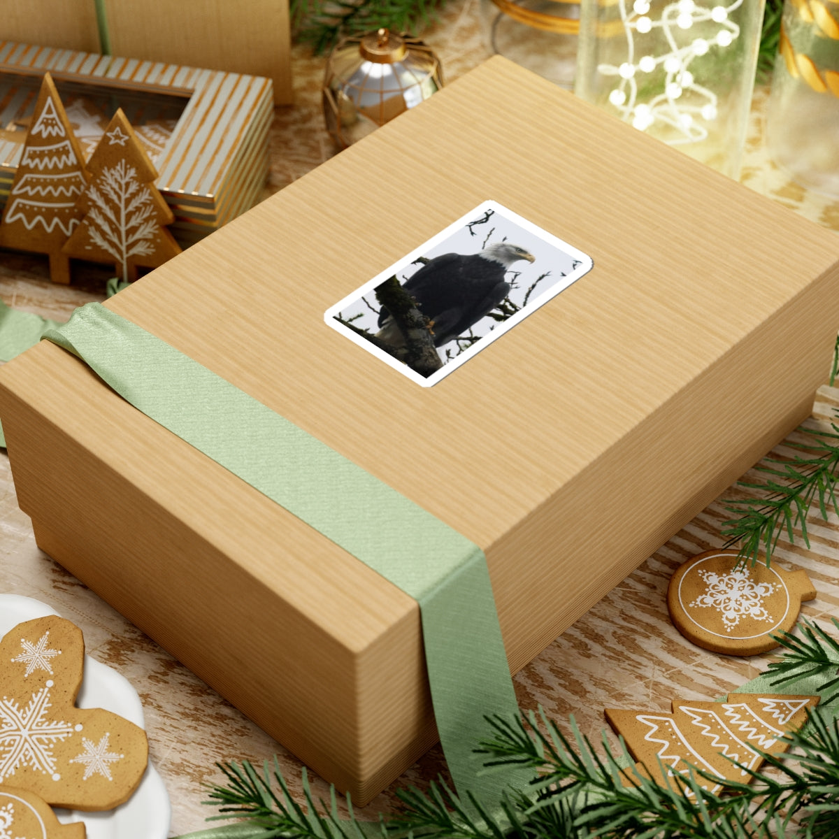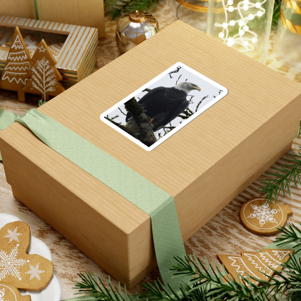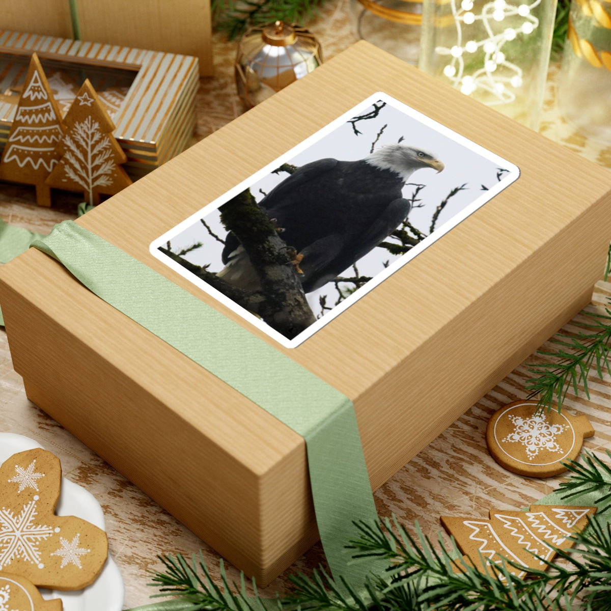 A bold, glossy vinyl sticker showing a stately bald eagle perched on a mossy branch. The rich blacks and crisp white head pop against subtle, overcast background tones — a quiet reminder of wild places and steady presence. It clings smoothly to laptops, journals, water-resistant cases, or any smooth flat surface and brings a touch of wilderness to everyday gear. The finish resists light scratches and applies bubble-free, so your eagle stays sharp and proud through daily use. Choose white or transparent backing and four sizes to match your space.