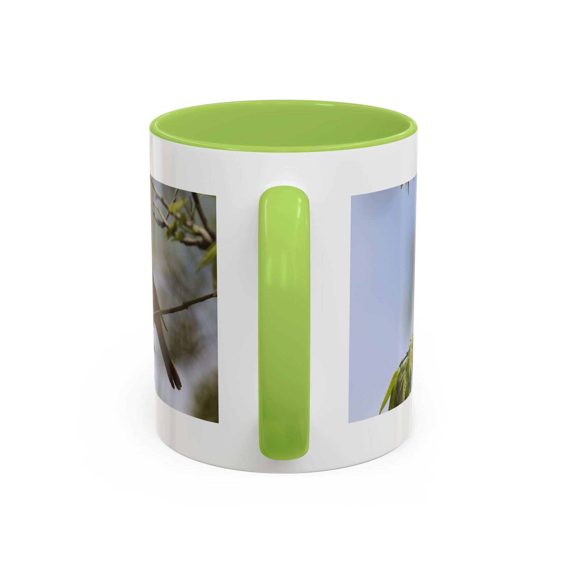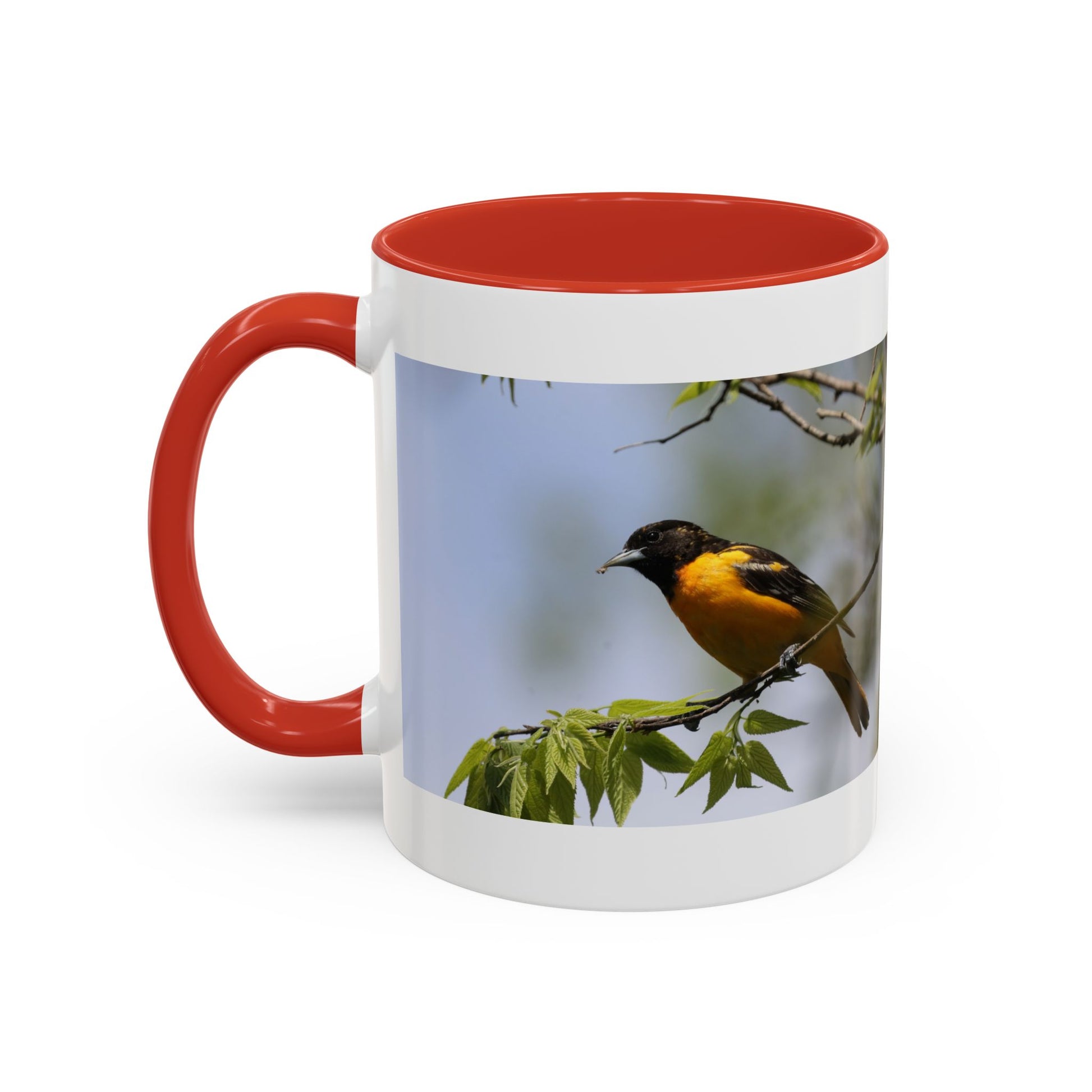 Morning light filters through the kitchen window. You lift this colorful ceramic mug and feel a quiet lift — the cheerful orange-and-black bird perched among soft green leaves brings a moment of wildlife close to home. The glossy contrast of a colored interior and handle frames the photo-wrap design, so every sip feels like a small nature walk. Sized for quick espresso or a long slow brew, this mug sits comfortably in hand thanks to its classic C-handle. It’s for people who notice birds at the feeder, keep a field guide on the table, and want their morning routine to feel a little like stepping outside.