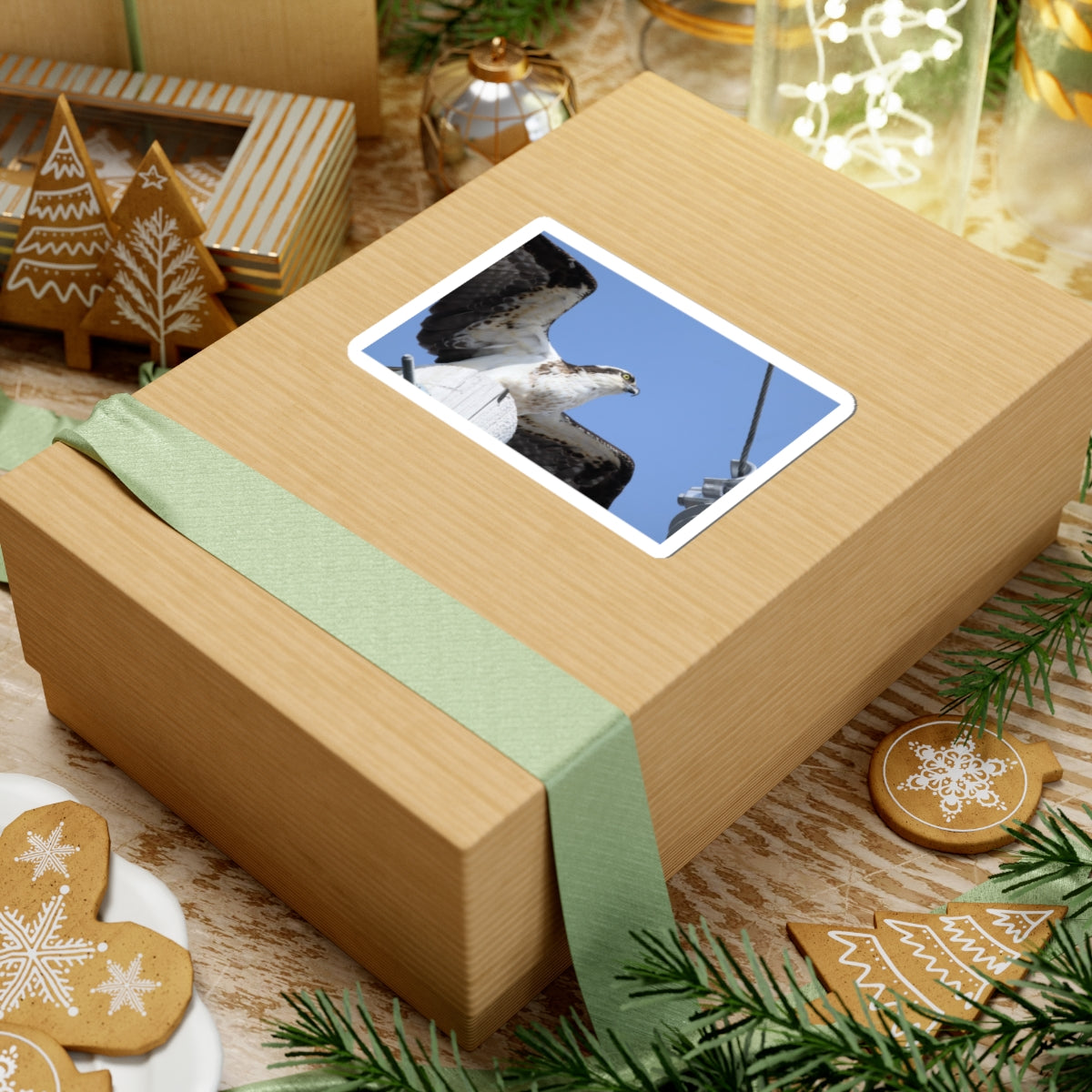 A striking osprey photograph printed as a glossy kiss-cut sticker that brings the thrill of the shoreline to your everyday gear. The bird’s outstretched wings and focused gaze are captured against a clear blue sky — a quiet moment of wild determination frozen in high-contrast color. Stick this on a laptop, journal, or water-resistant surface indoors and let the image remind you of early mornings by the pier, the snap of wind on your face, and the patient precision of a hunter at work. The bold composition reads well at small sizes, so the sticker stays visually strong whether it’s perched on a notebook or marking your gear. For birders, coastal photographers, or anyone who loves avian life, this feels like a small talisman of the sea’s edge you can carry with you.