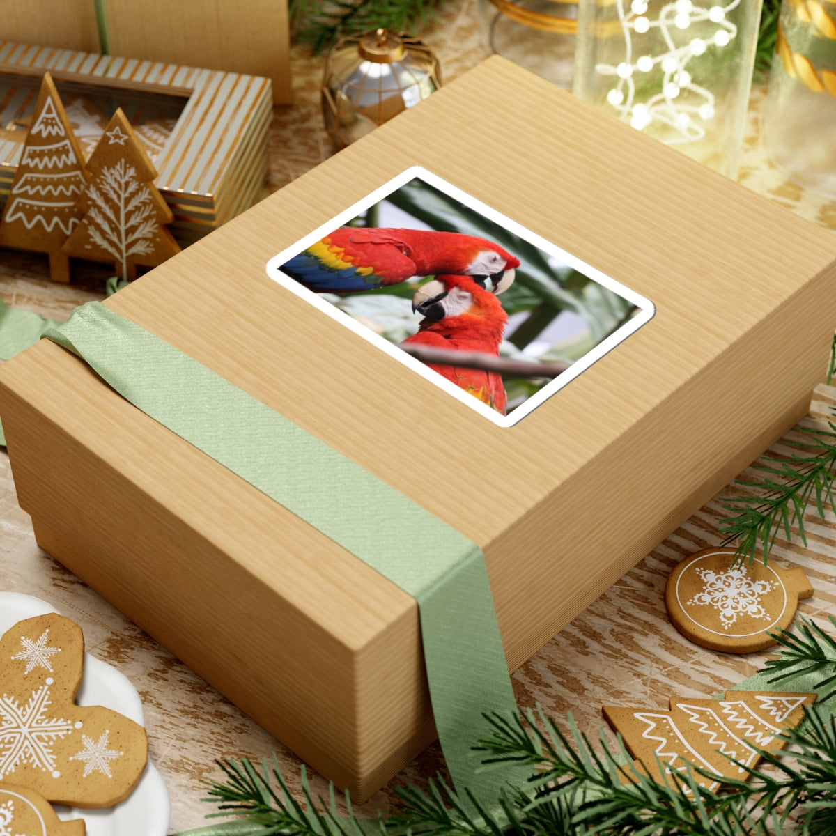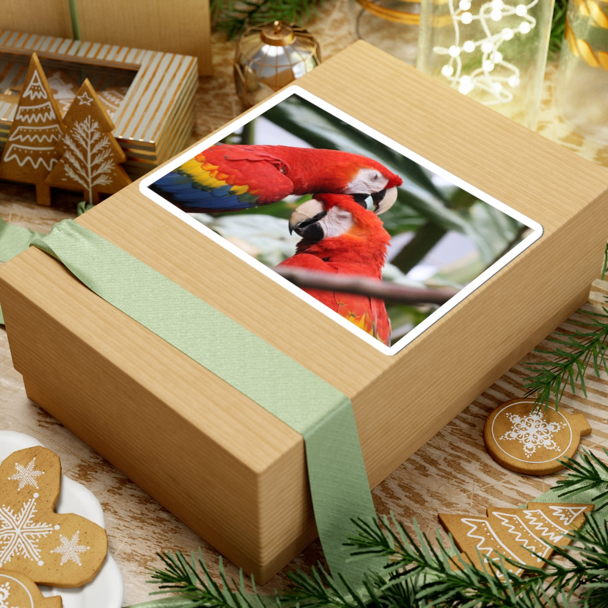 A glossy kiss-cut sticker featuring two scarlet macaws in a tender moment, captured in vivid reds, blues, and yellows. This durable vinyl decal brings a burst of tropical color to laptops, journals, water-resistant cases, and other smooth surfaces. The scratch-resistant gloss finish keeps the artwork bright, while the tough permanent adhesive ensures a smooth, bubble-free application. Choose white or transparent backing and from four sizes to match your layout. This sticker speaks to anyone who loves exotic birds, jungle vibes, or adding a cheerful, nature-inspired accent to everyday gear.