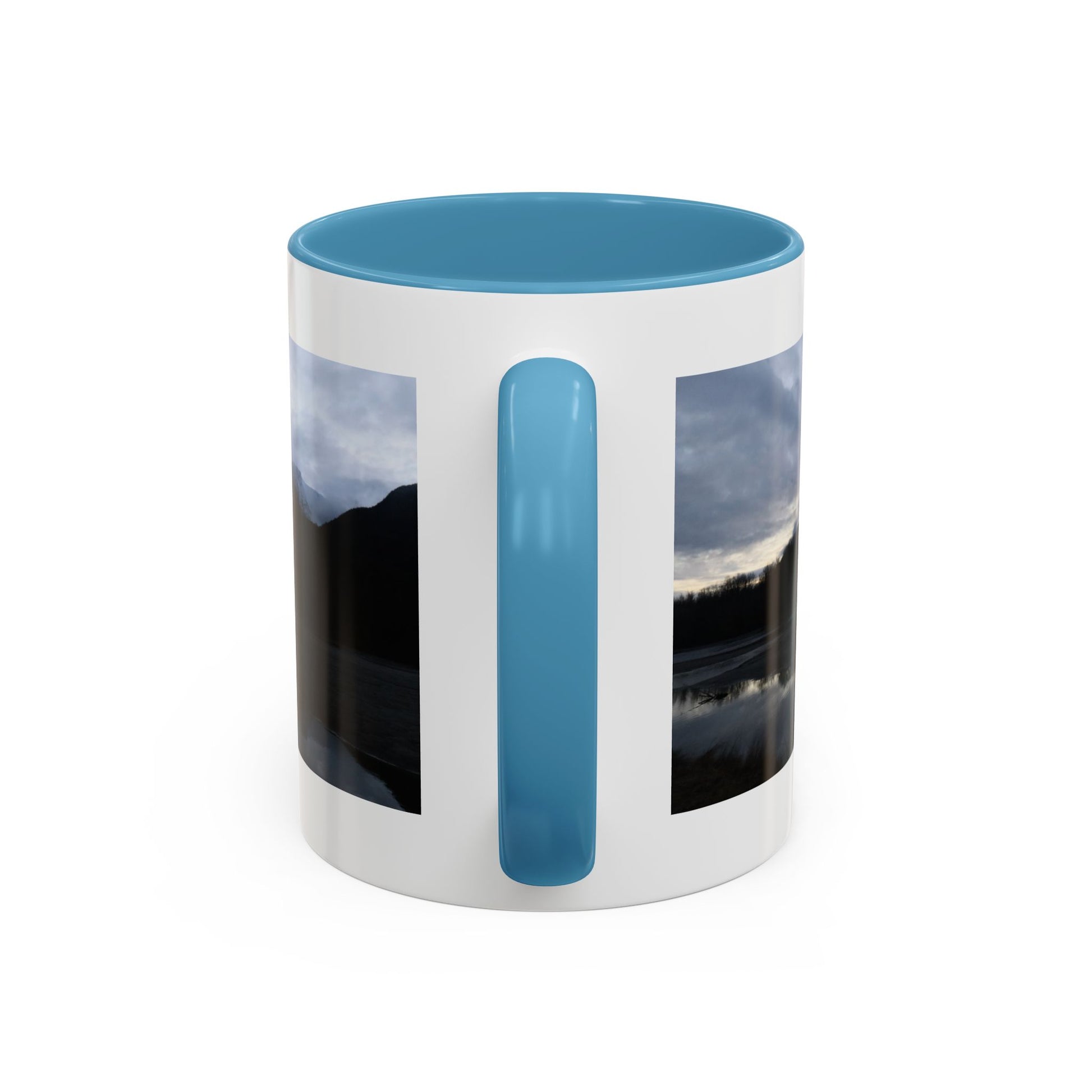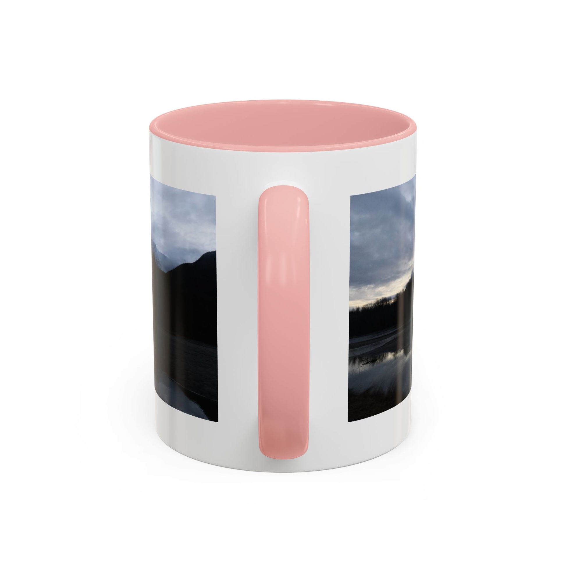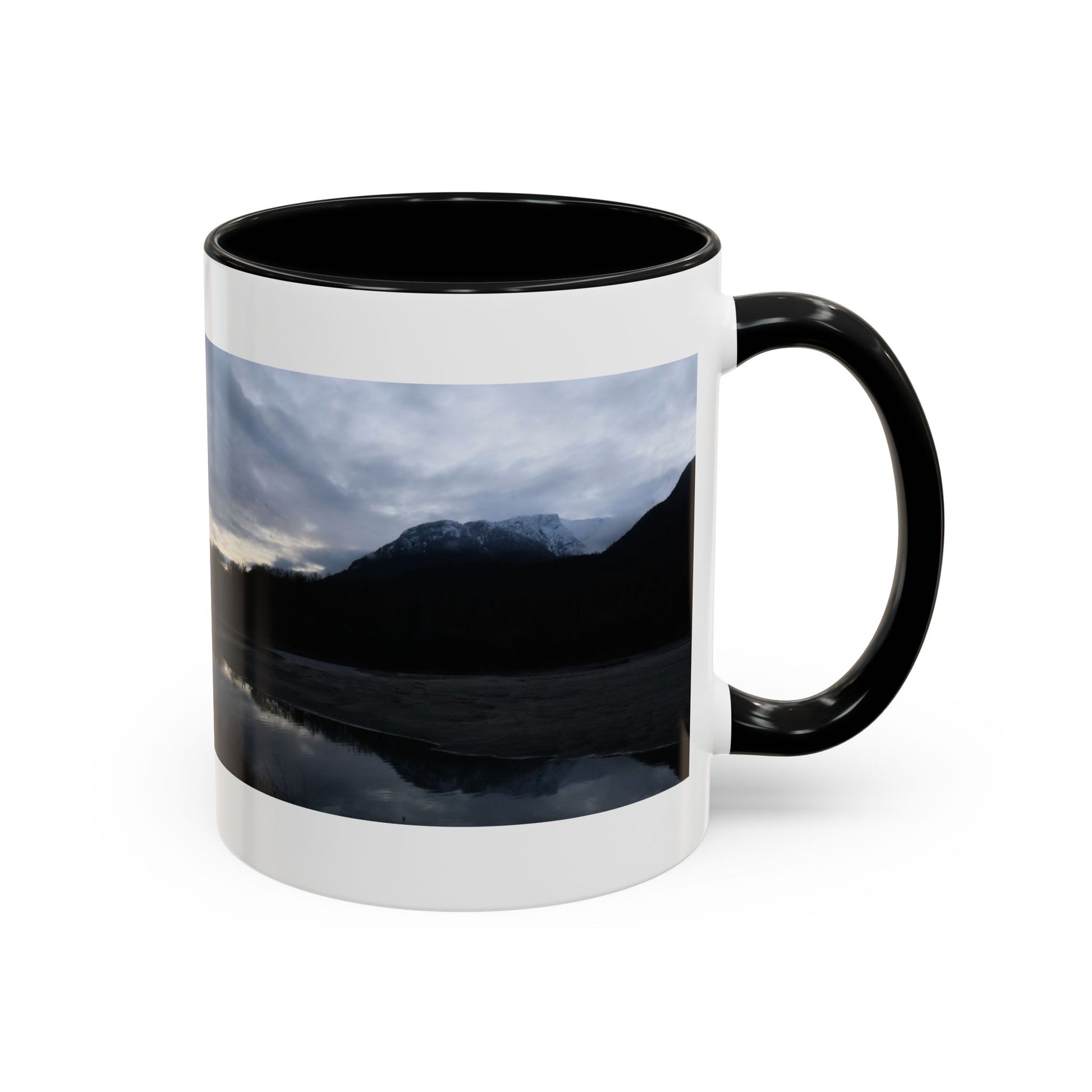 Slow, quiet mornings beside a still lake — that calm finds its way into this ceramic mug. Dark mountains and a cloud-stippled sky wrap around the cup, their reflection mirrored in the water like a private pause before the day begins. The colored interior and handle add a subtle contrast that frames the scene and warms the silhouette. Reach for this mug when you want a moment of brokerage between adventure and routine: coffee steamed against a cool window, tea shared with a friend who understands long drives and wide horizons. It sits comfortably in your hands with a C-shaped handle and glossy finish, ready for daily use and for those small rituals that feel like returning home.