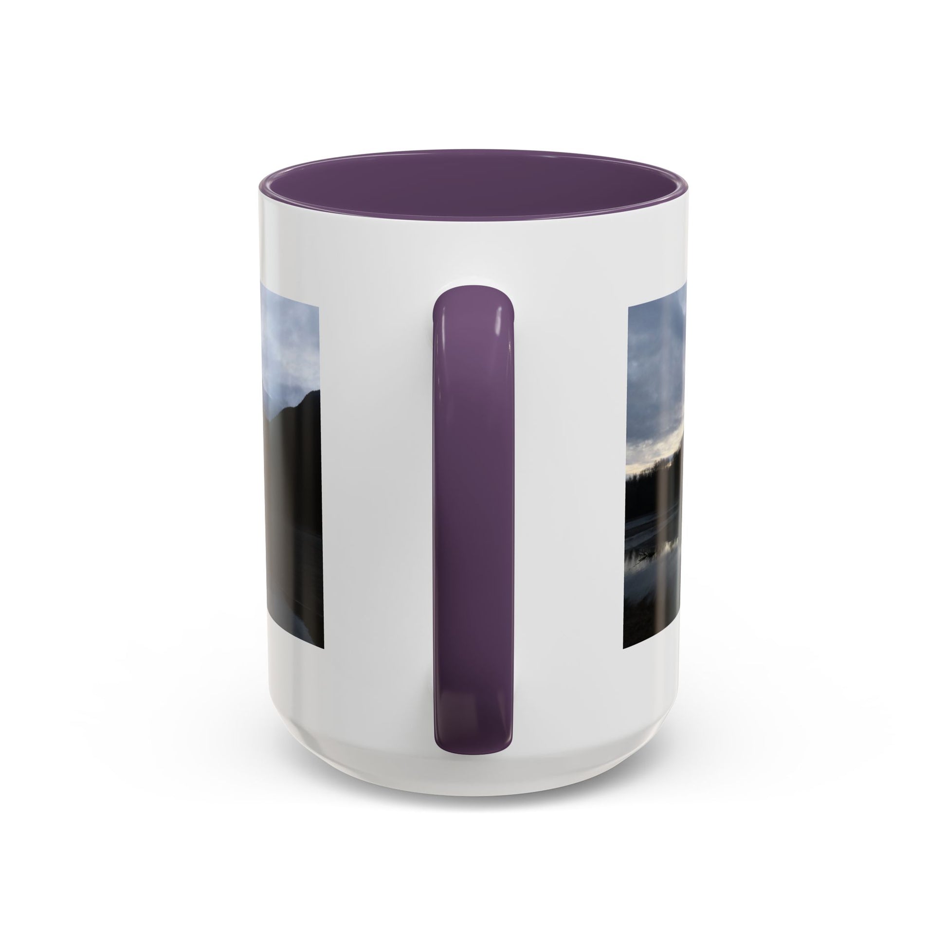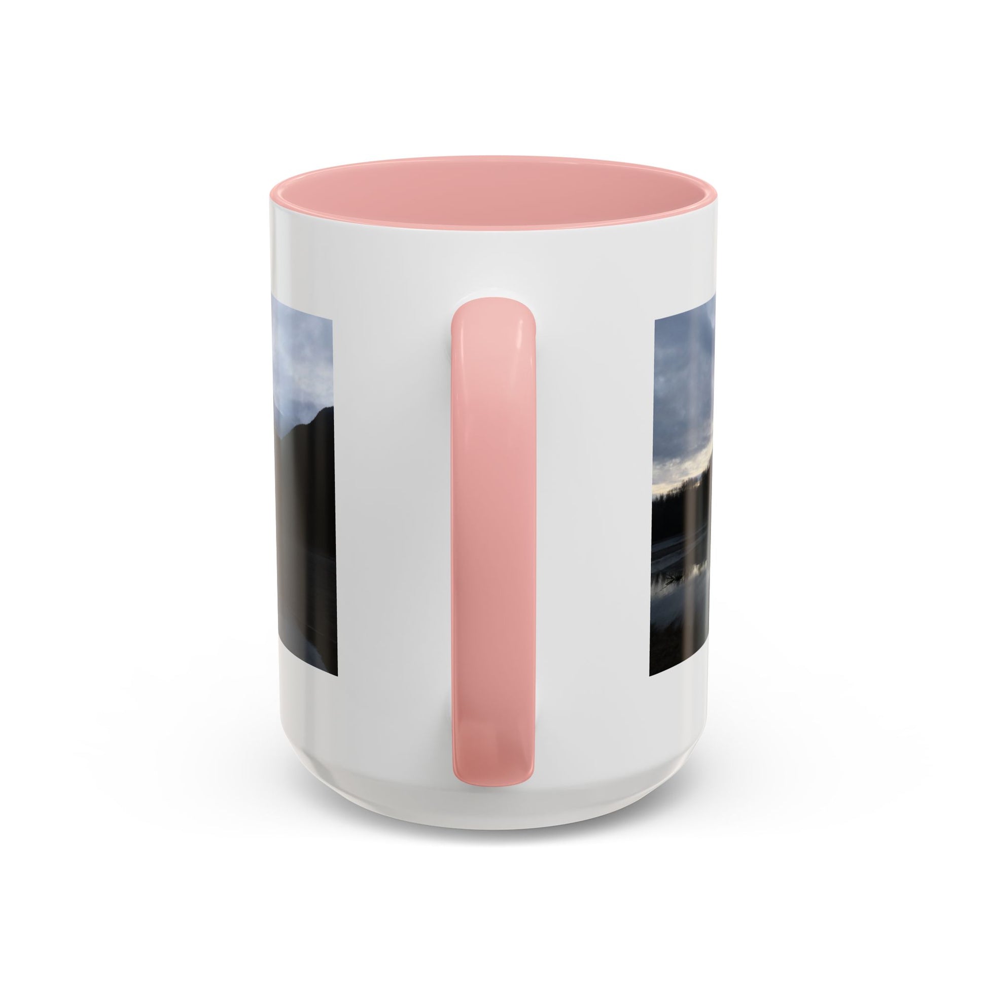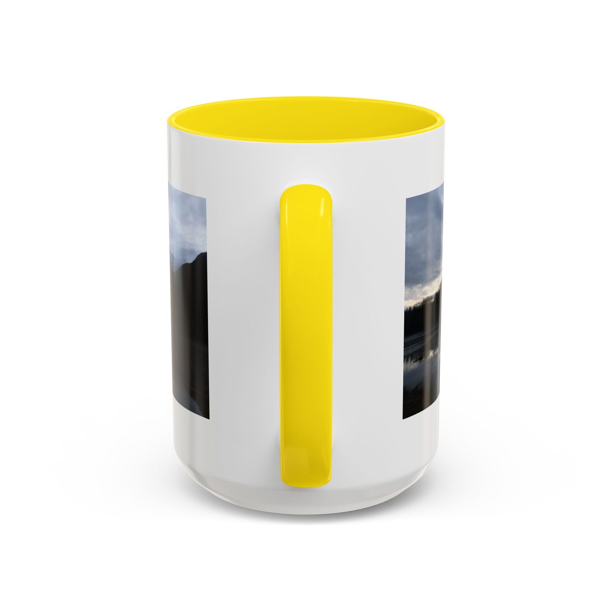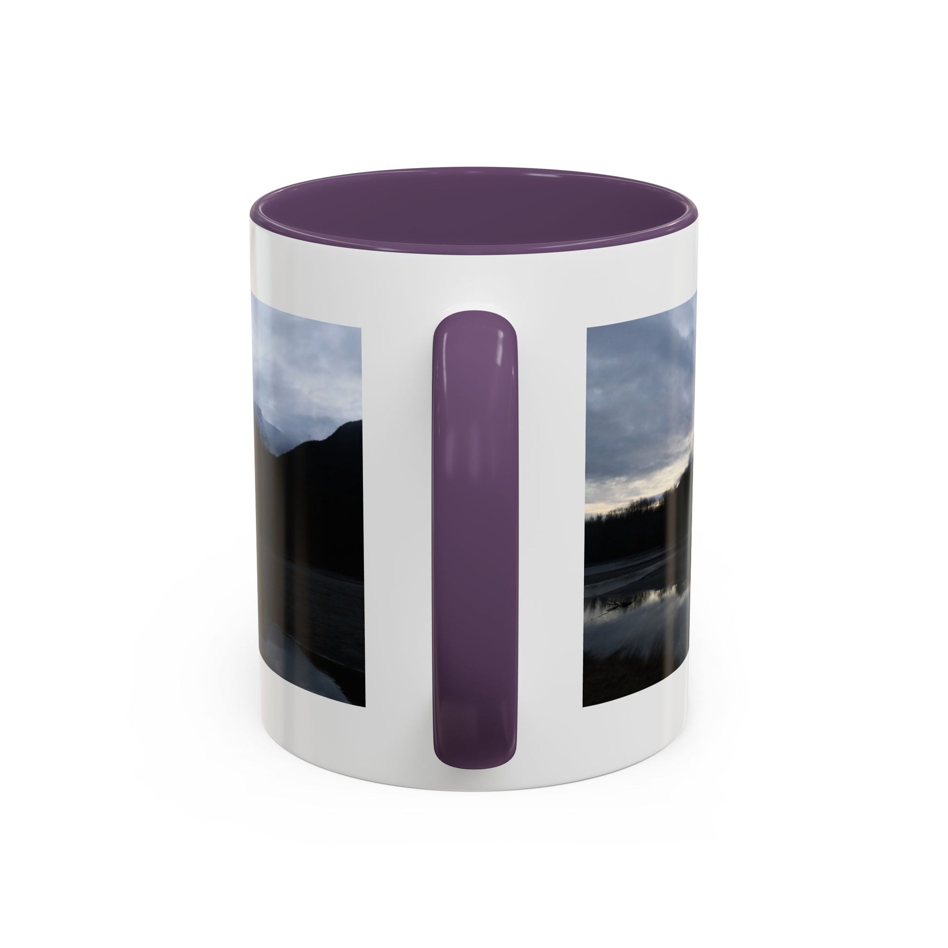 Slow, quiet mornings beside a still lake — that calm finds its way into this ceramic mug. Dark mountains and a cloud-stippled sky wrap around the cup, their reflection mirrored in the water like a private pause before the day begins. The colored interior and handle add a subtle contrast that frames the scene and warms the silhouette. Reach for this mug when you want a moment of brokerage between adventure and routine: coffee steamed against a cool window, tea shared with a friend who understands long drives and wide horizons. It sits comfortably in your hands with a C-shaped handle and glossy finish, ready for daily use and for those small rituals that feel like returning home.