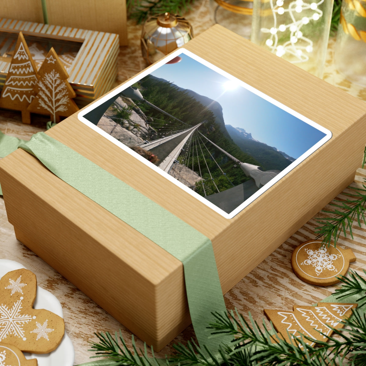 A kiss-cut vinyl sticker that captures the thrill of a mountain suspension bridge under bright blue skies. The glossy finish amplifies vibrant greens and deep blues, while the durable vinyl and strong permanent adhesive keep this scene stuck to laptops, journals, water-resistant cases, and more. Choose white or transparent backing and one of four sizes to match your setup. Lightweight and easy to apply — peel, press, and smooth for a bubble-free result that holds through daily wear and indoor adventures.