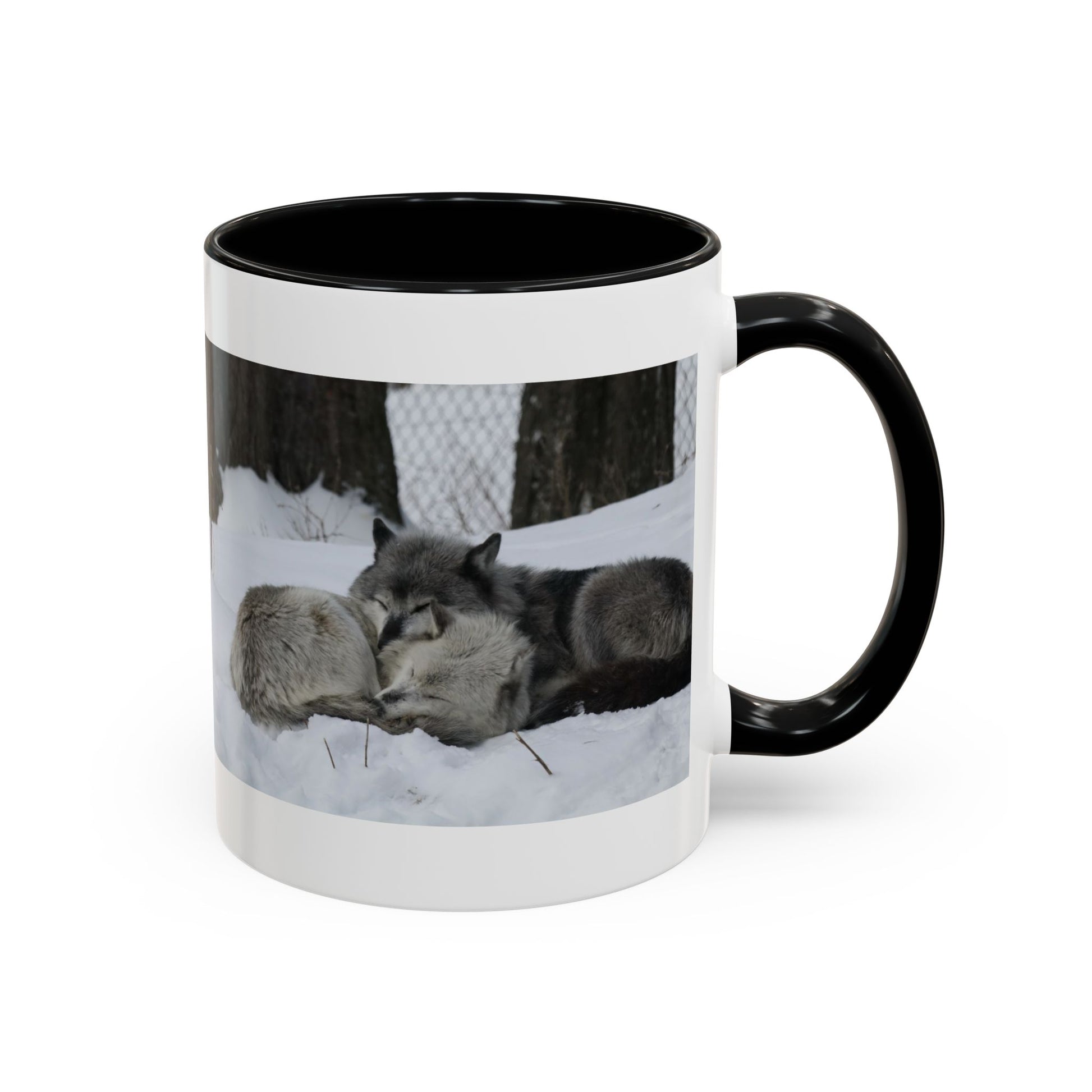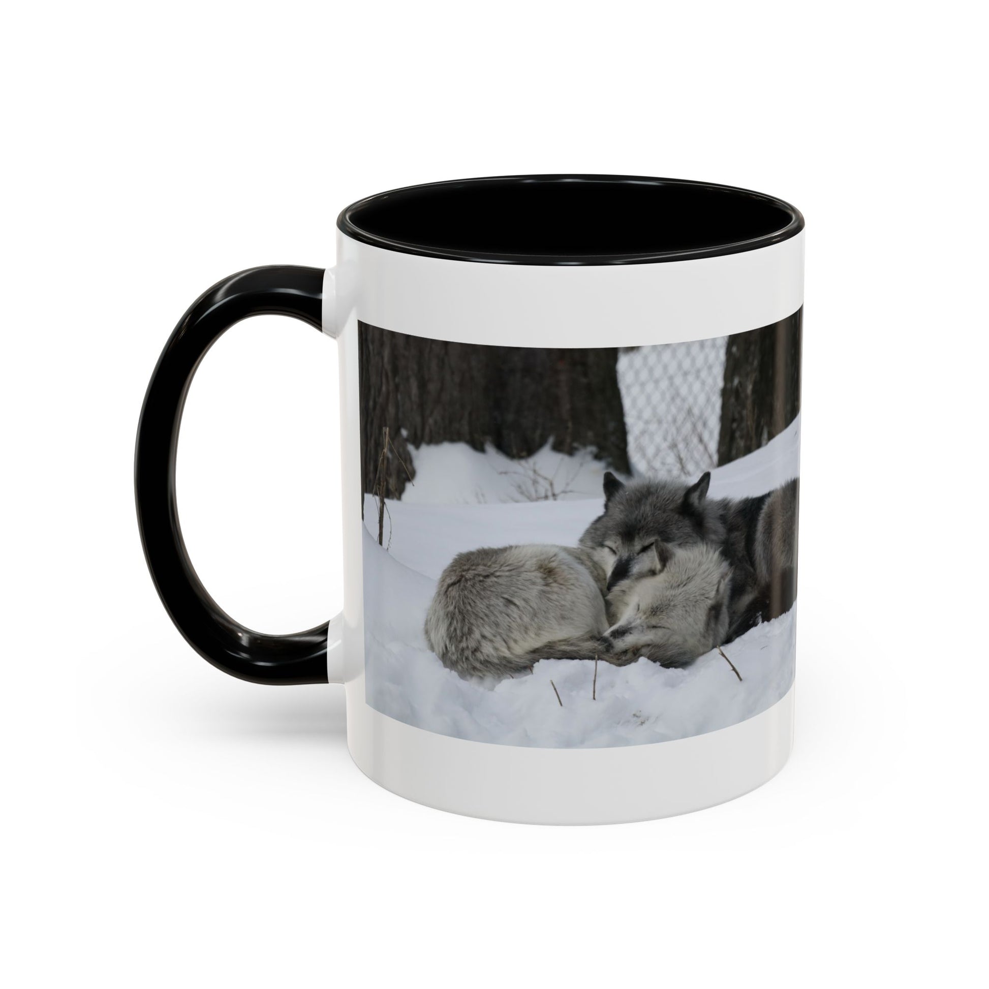 Warmth in every sip. This ceramic Accent Coffee Mug pairs a glossy black interior and handle with a crisp white exterior band, showcasing a quiet winter scene of two wolves resting in fresh snow. It feels like a slow morning at a remote cabin — soft breath in cold air, muted snow underfoot, and a steady companion by your side. The image wraps the mug, so each angle reveals the peaceful duo and the textured trunks behind them. It’s the kind of cup that joins your ritual: hot coffee, a moment of stillness, and the steady presence of the wild close at hand.
